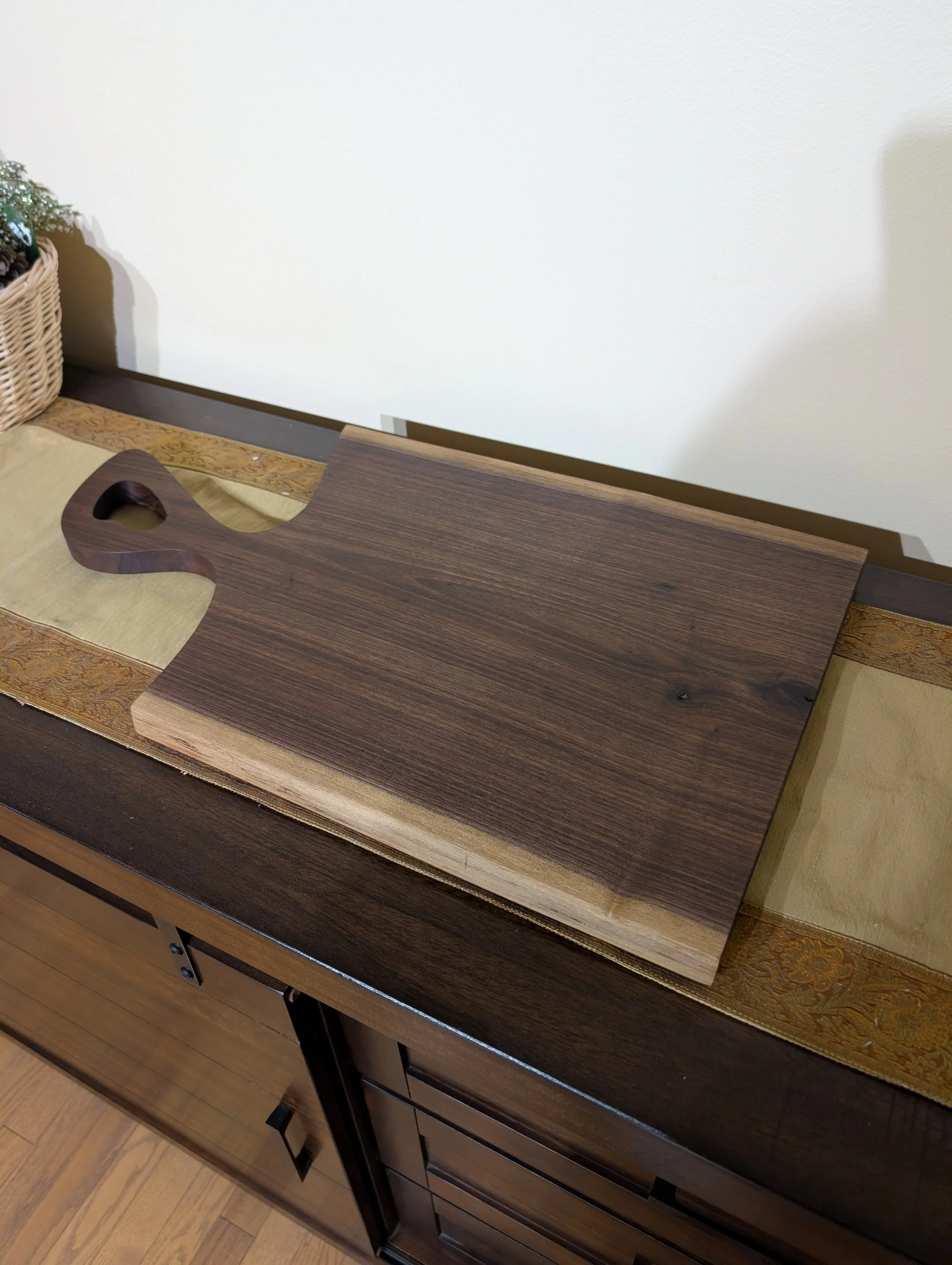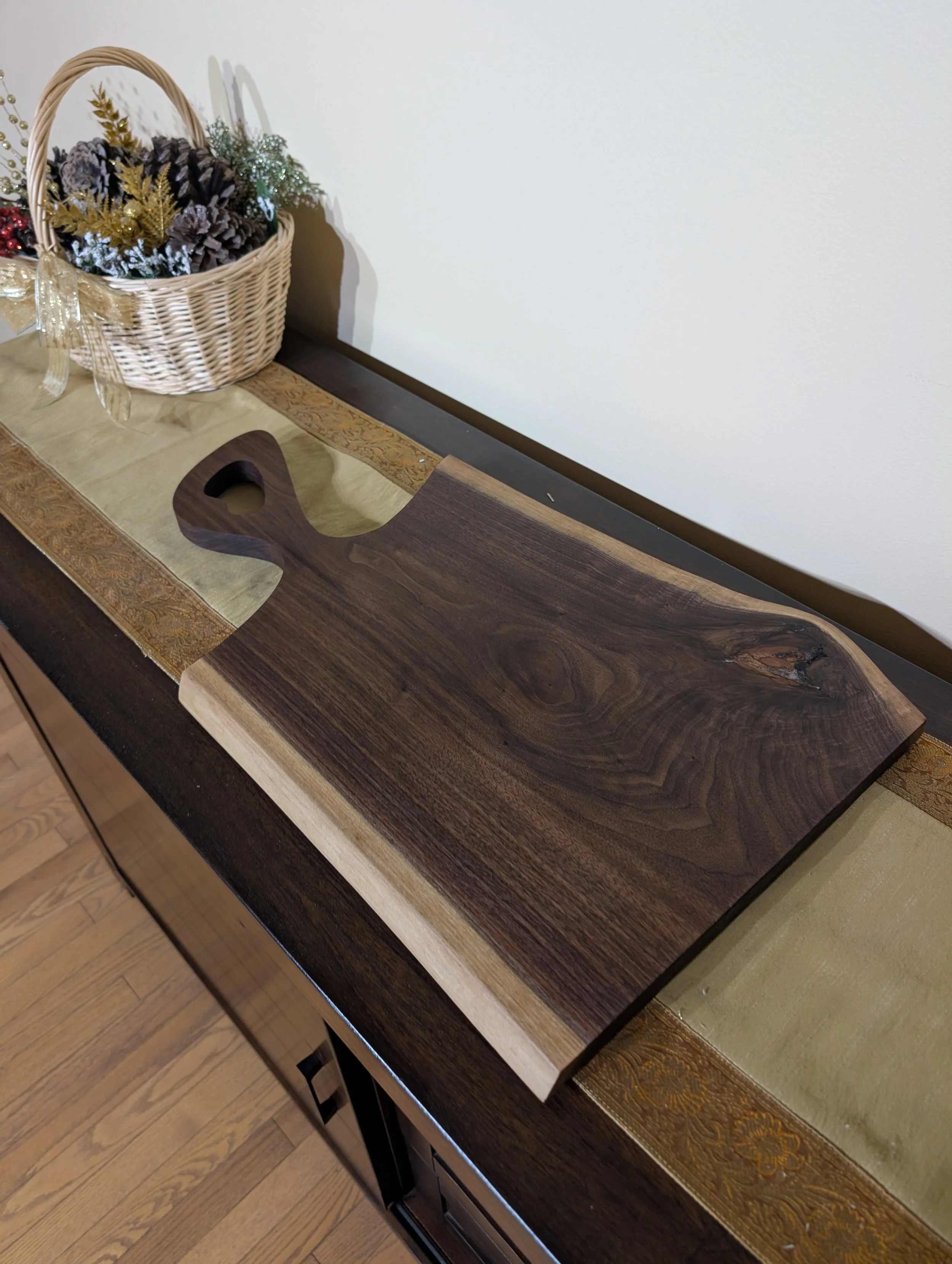 Each piece is carefully shaped from rich, dark Black Walnut—known for its deep grain and warm tones that instantly elevate any spread. Finished with Walrus Oil for a food-safe, satin sheen that highlights the natural beauty of the wood, every board is one of a kind.